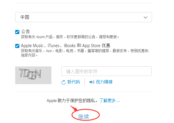 (2)信息填写完毕之后,点击【继续】按钮,将发送验证码至你的邮箱,点击邮箱查看并输入验证码。