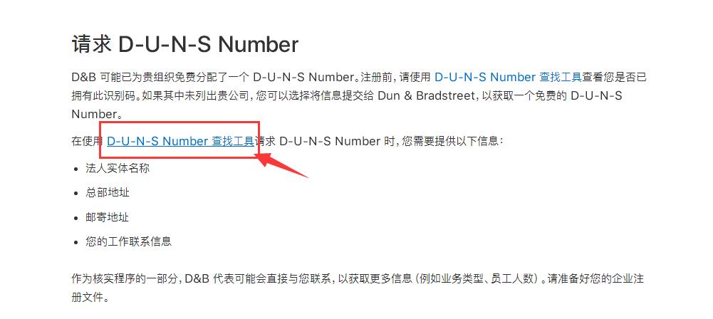 (5)点击【D-U-N-S Number look tool】按钮进入邓白氏注册信息页面,填写相应的信息并提交资料。